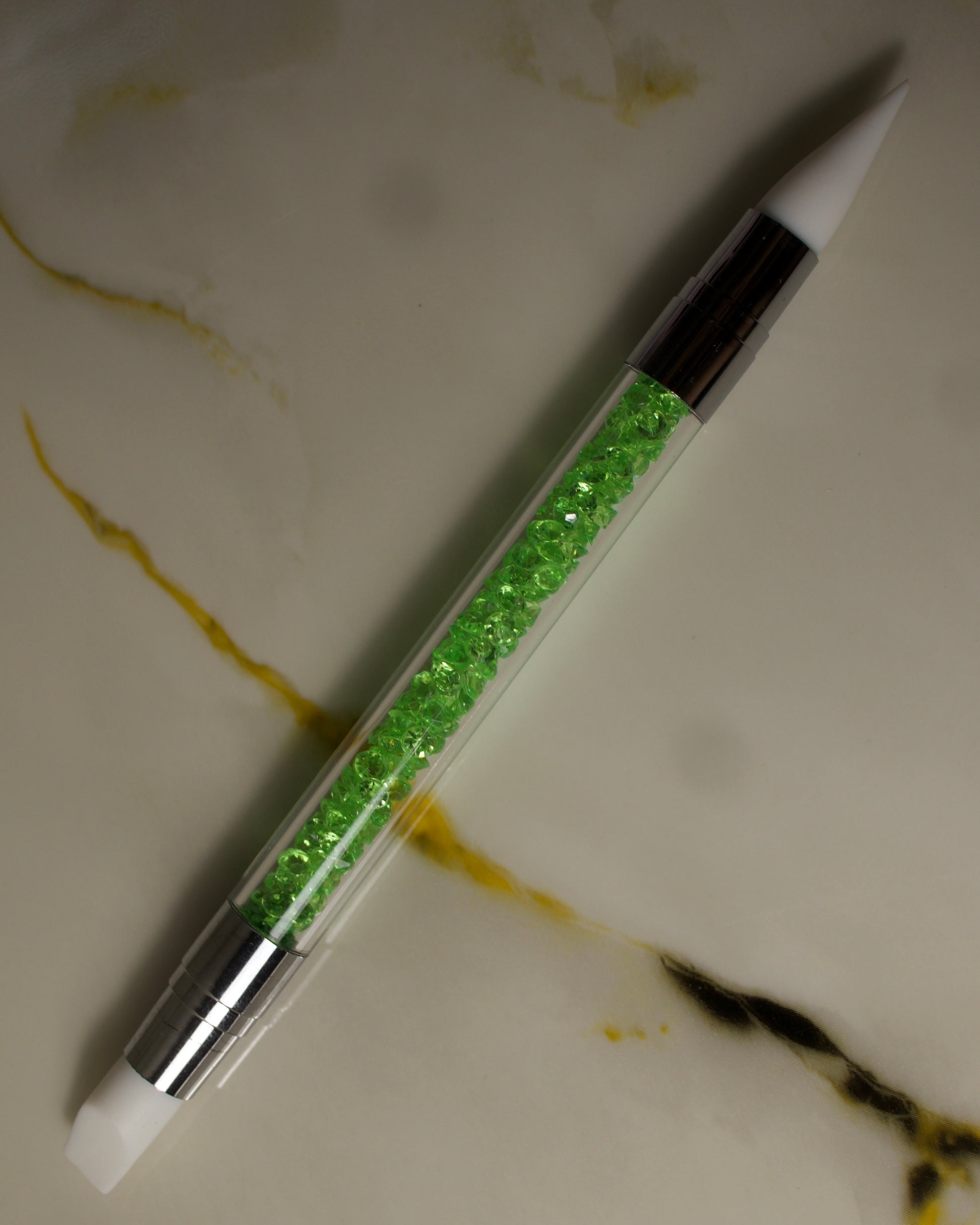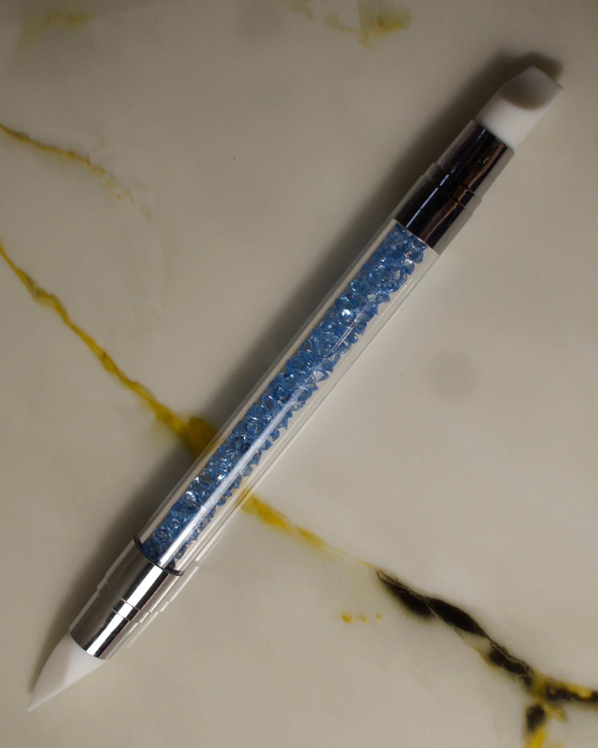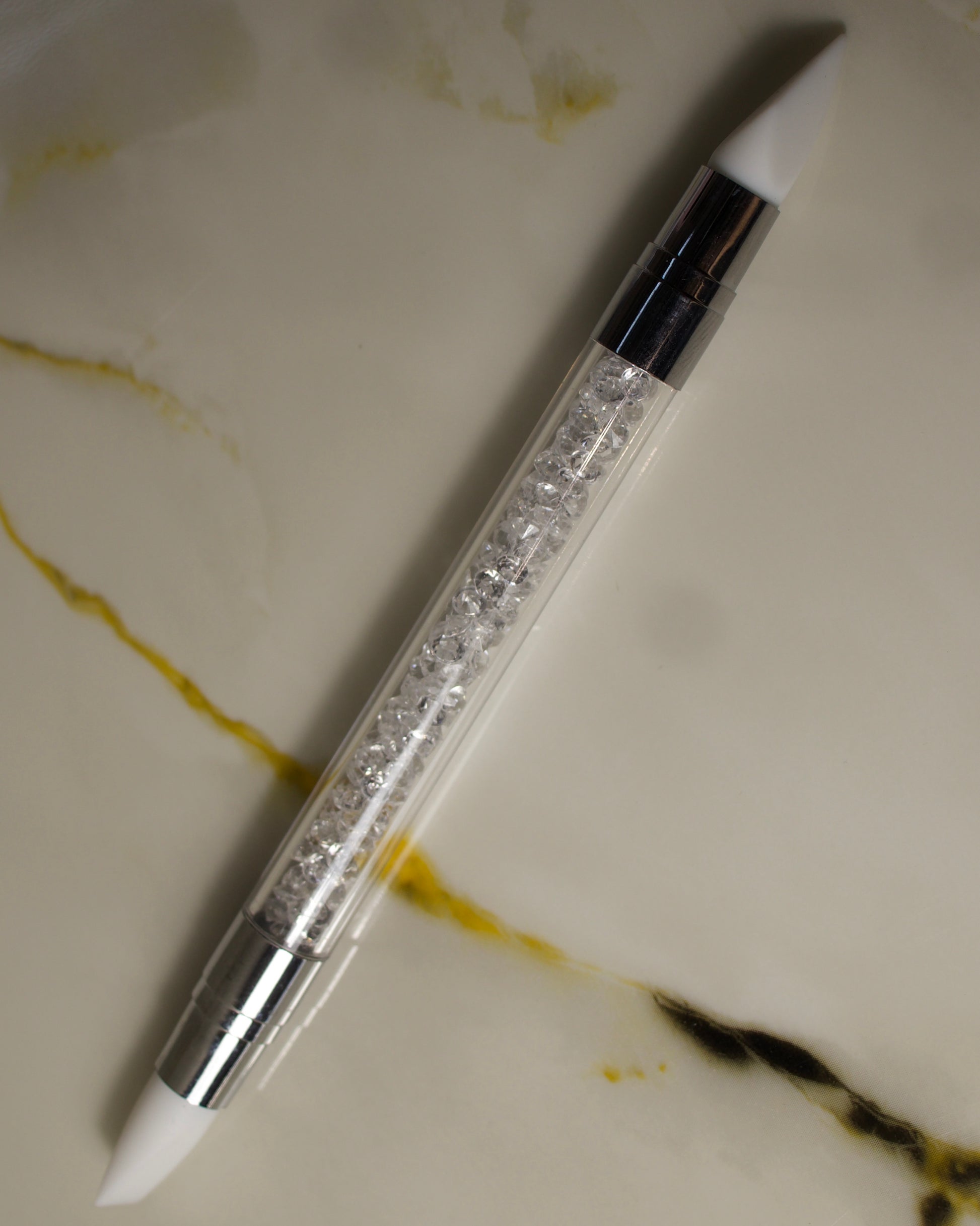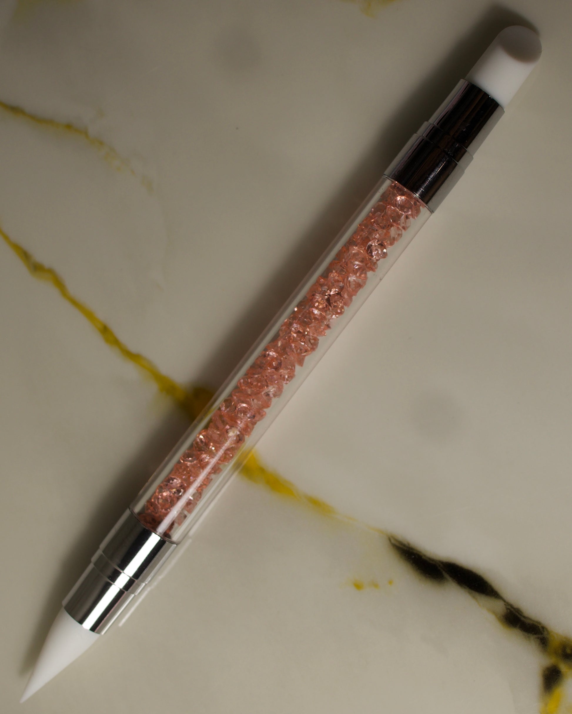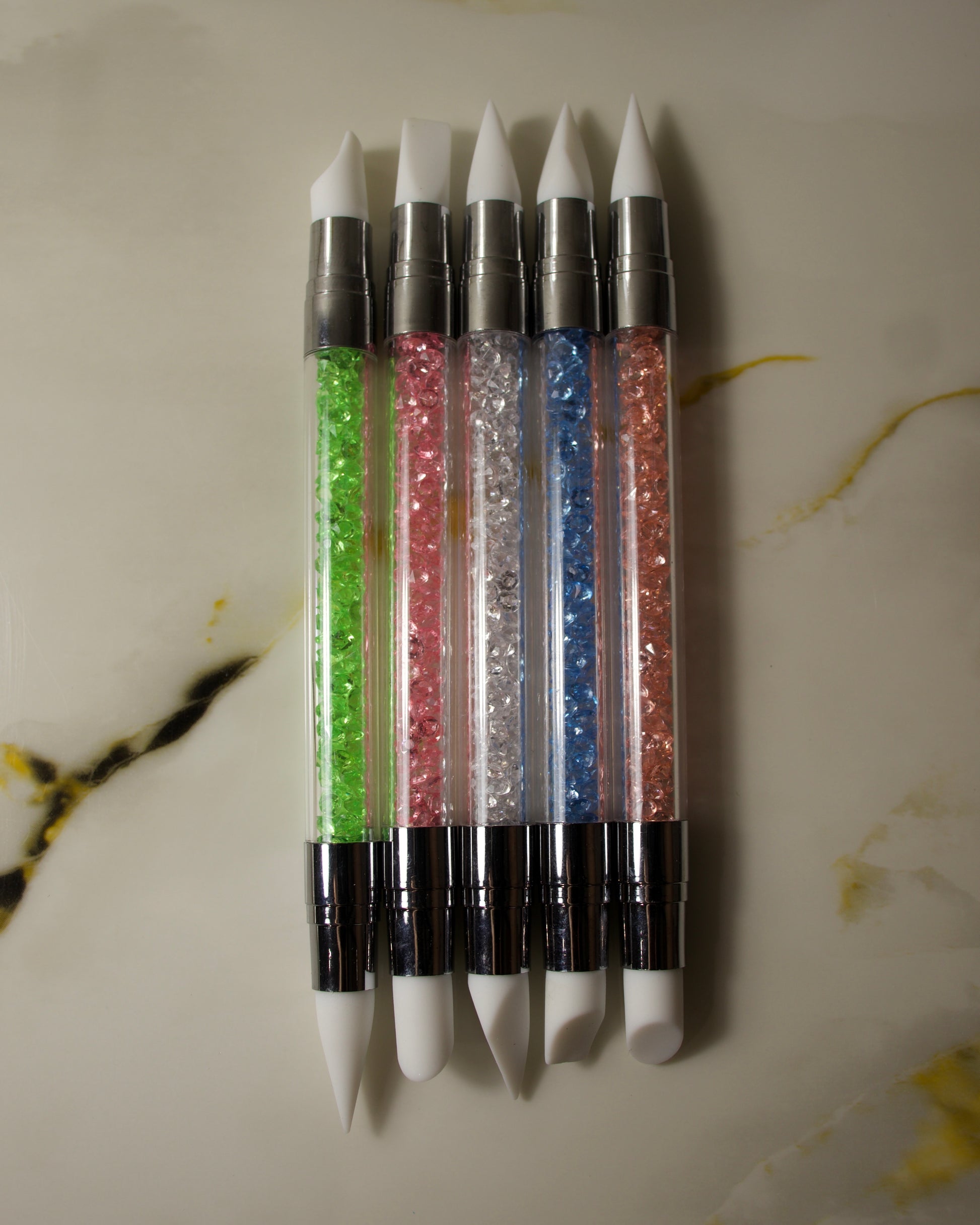 Set de 5 pinceles de silicona con puntas variadas, ideales para trabajar disños en 3D, manipular rhinestones, perlas y mucho más. Diseño elegante con mango de cristal y cristales decorativos.