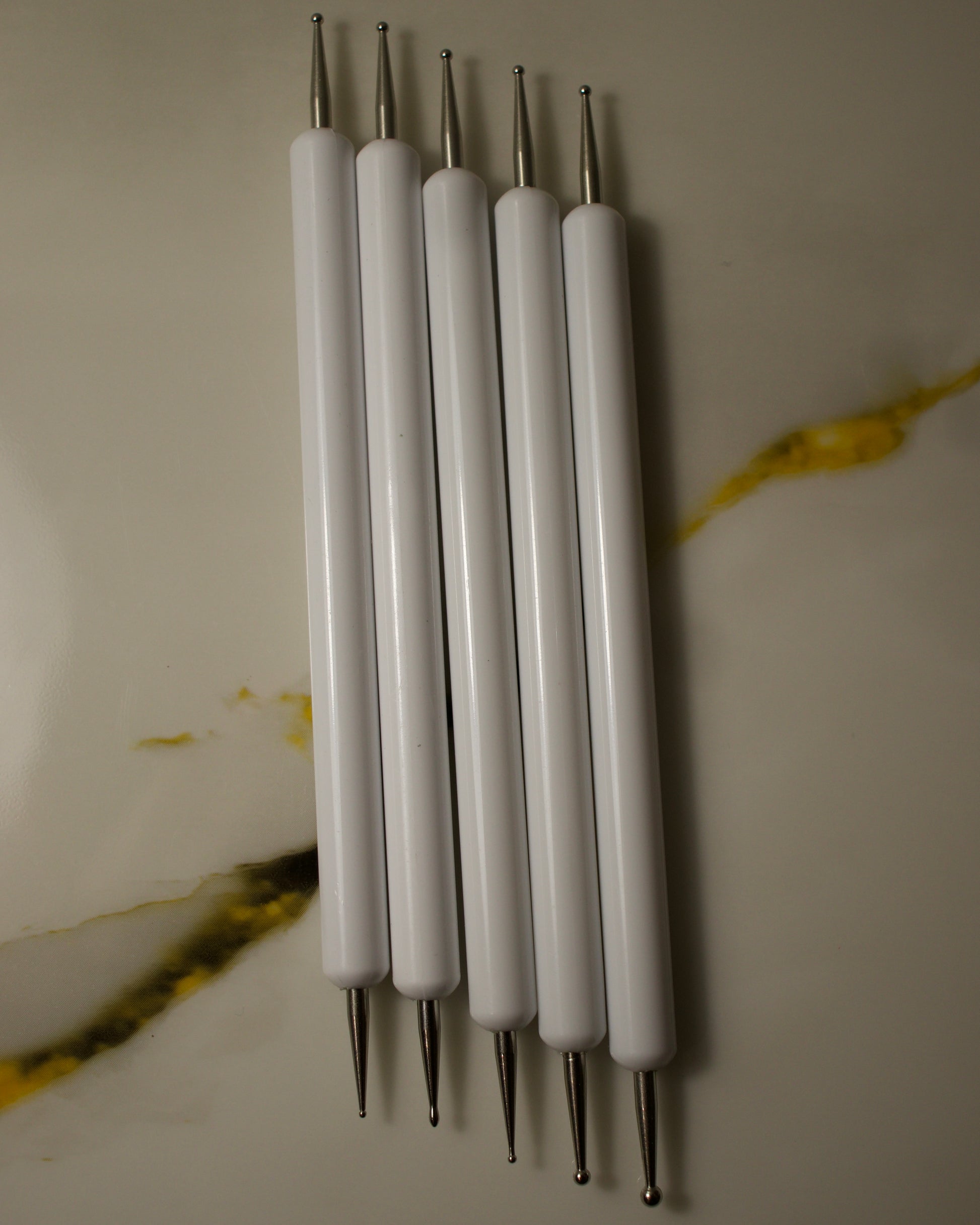 Set de 5 punteros dobles con esferas metálicas de distintos tamaños, perfectos para crear puntos, flores, diseños creativos y mucho más.