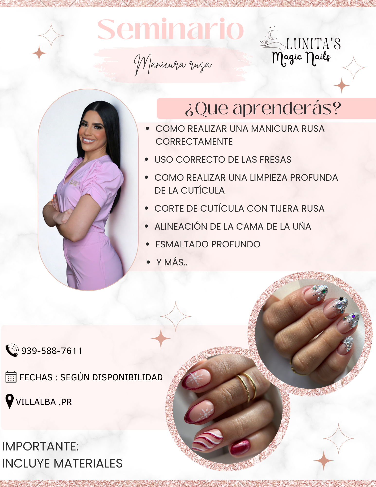 Domina la técnica de manicura rusa con este seminario privado y presencial. Aprende a realizar una limpieza profunda de la cutícula y a perfeccionar la alineación de la uña natural para lograr un acabado impecable y duradero.